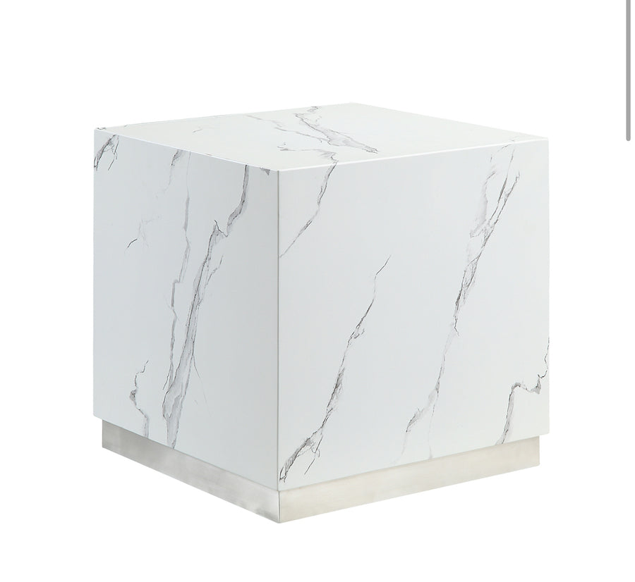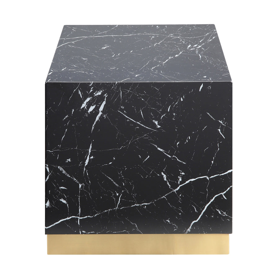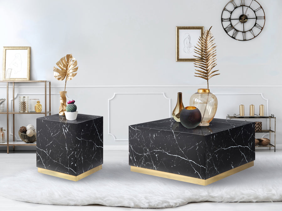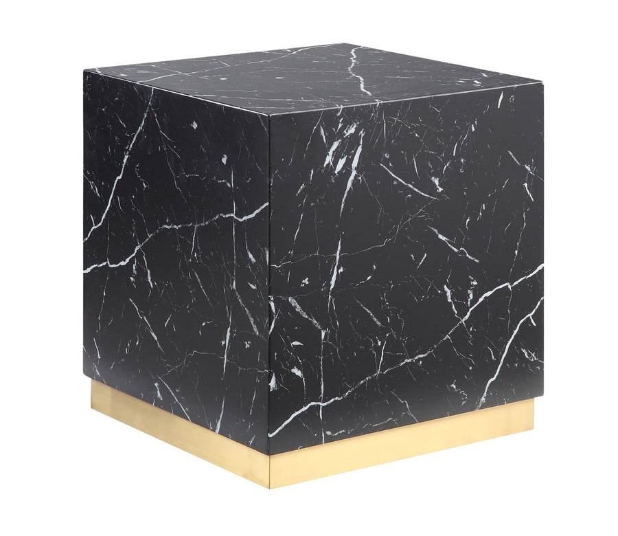 Your living room is certain to stand out and delight guests with the addition of the alluring Astraia occasional collection. This eye-catching end table makes a bold statement thanks to its unique solid design and exquisite faux marble finish. Striking black is shot through with white veining, accented by the contrasting brushed gold finish of the metal base for an extra touch of glamour. A clear matte top coat adds a subtle luster and durability, protecting your table from stains and scratches and creating a surface that is easy to clean and maintain. Coordinating large square coffee table, small square coffee table, and rectangular coffee table also available. Also available in white marble and brushed nickel finish.