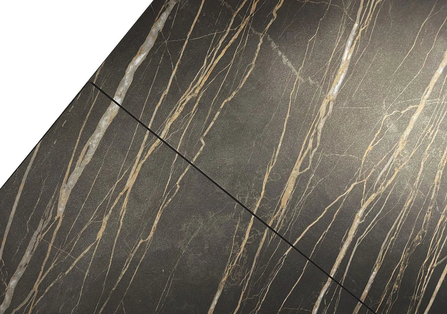 The Century Extending Dining Table is a stunning and versatile piece of furniture that will elevate any dining room. The table features a beautiful noire desir ceramic top that imitates the look and texture of natural stone, adding a touch of sophistication to any dining space. The ceramic top is not only visually striking but also durable and easy to clean, making it ideal for daily use. The table's unique base is made from black powder-coated steel and features a striking X-shaped structure that provide a stable and sturdy foundation.
