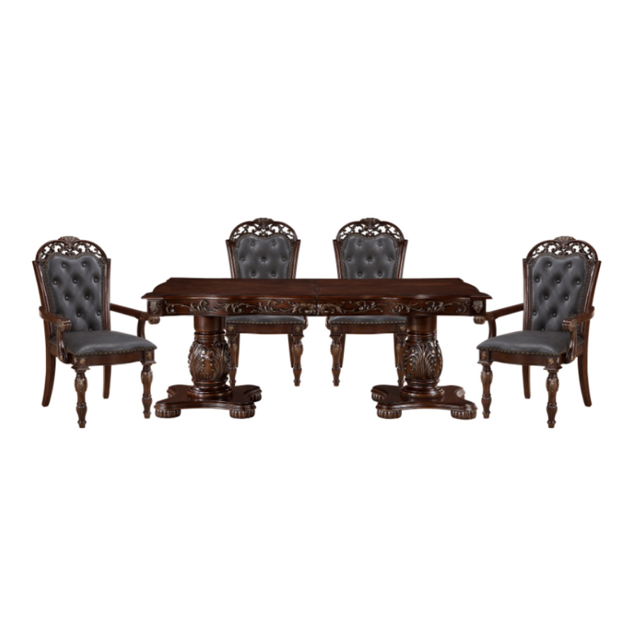 Rich in the aesthetic of Old-World tradition, the design of the Adelina Collection is the culmination of classic accenting that creates an elegant presentation for your dining room. The dark brown faux leather padded seat and back of the arm chair features button-tufting, wood-framed profile, nailhead trim, and intricately detailed front legs and chair back. Furthering the timeless aesthetic that permeates the collection, is the cherry finish, with gold tipping, over birch veneer and pine solids.