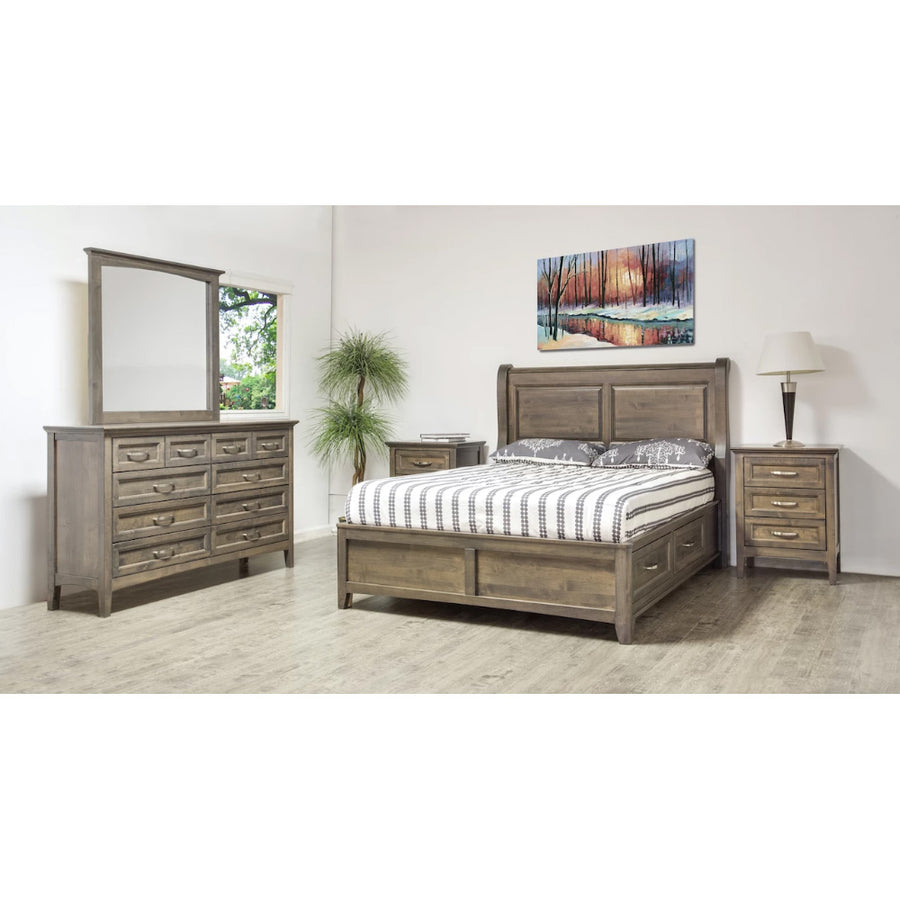 Farmhouse Bedroom Suite contains a storage or non-storage bed in any size of your choice with a nightstand, a regulat 10 drawers dresser and a mirror.