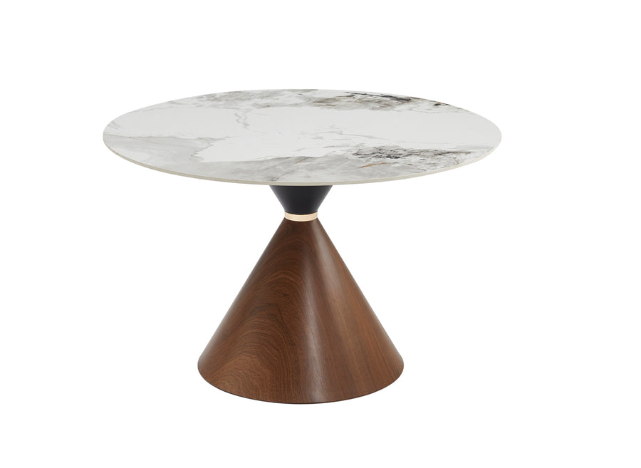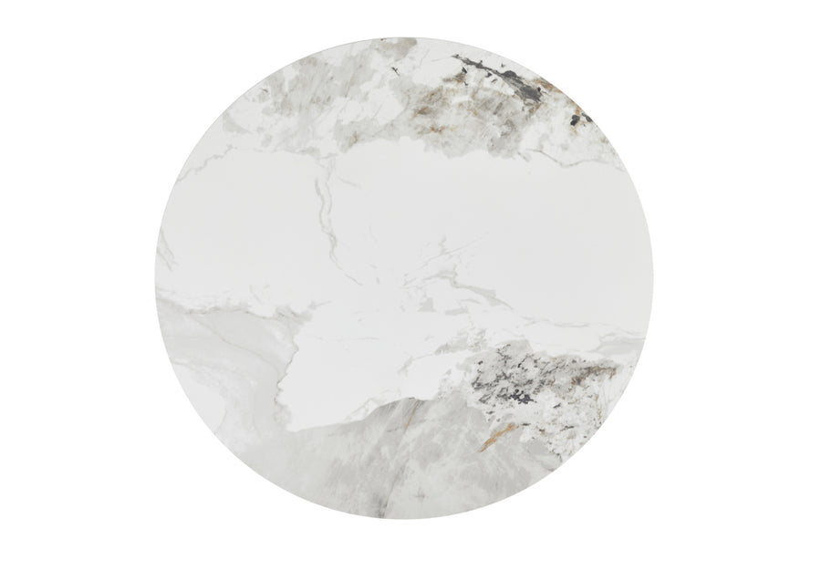 The statuesque form of the Greer Collection is an impeccable way to breathe style into your modern dining room. Combining art with function, this visually striking dinette features a rounded tabletop supported by a dramatic hourglass pedestal base. The metal base has a rich brown faux cherry wood appearance - accented by black and gold - that serves to contrast elegantly with the white and grey marble guise of the sintered stone top. Resistant to scratches, stains, and extreme temperatures, the sintered stone top is also non-porous and easier to clean and maintain than true marble. Unforgettably chic and able to comfortably seat four people, the Greer lends unmistakable charm to your contemporary dining room.