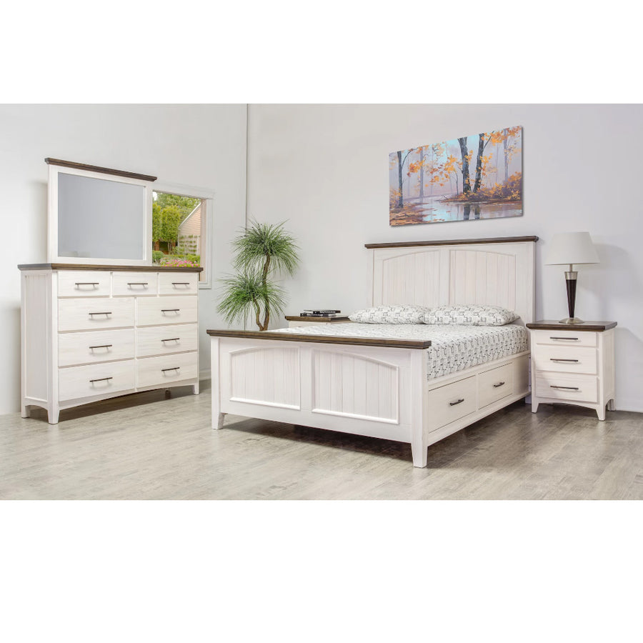 Sophia Bedroom Suite contains a storage, non-storage or low profile bed in any size of your choice with a nightstand, 7 drawers dresser and a mirror.