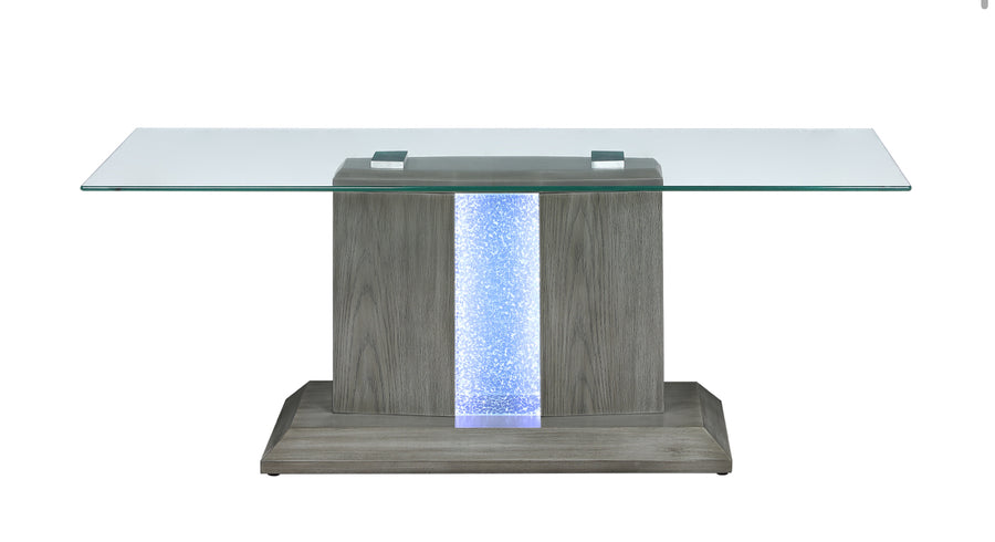 Light up your living room with the contemporary styling of the Spectra cocktail table - literally! Combining the classic look of a grey wood finish with a modern profile crowned by a clear tempered glass top, the Spectra brings more than just good taste to your home. The pedestal base features sophisticated embedded etched glass panels that showcase 3-way adjustable cool white LED lighting, all controlled by a touch of the button located at the table's base. Create a unique ambience while entertaining or simply ensure your living room doesn't get too dark; either way, the Spectra will enhance your décor enormously.