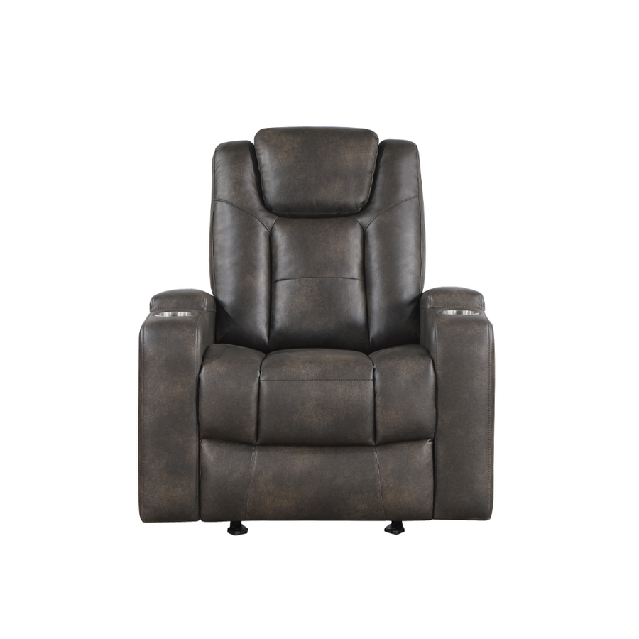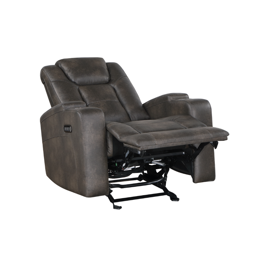 The versatility of its many features makes the McBride Power Glider Recliner almost seem like a Swiss Army Knife in your living room. Is your phone dying but you're waiting for a call? Keep it charging close by with the built-in USB ports. Can't wait to relax after a long day? Power reclining is at your service, allowing you to stretch out and customize your position thanks to the side-mounted power button. Craving a cool drink? It will stay in easy reach thanks to the integrated armrest cupholders. And that doesn't even account for the tranquil sensation of the gliding function's gentle motion. Draped in soft breathable leather gel in a universally neutral brown-grey hue, this recliner also sports a modern profile with track arms, stitched detailing, cushioned seats, and a generously padded headrest. Special features aside, comfort and style is clearly uppermost in the McBride's design.