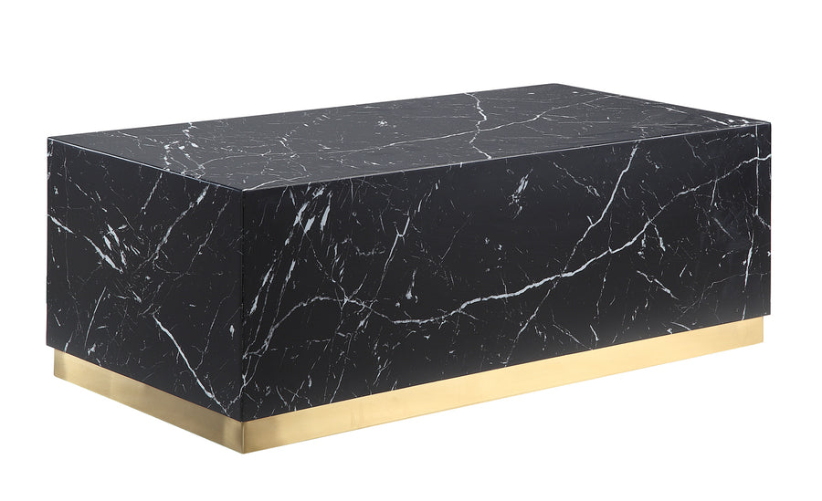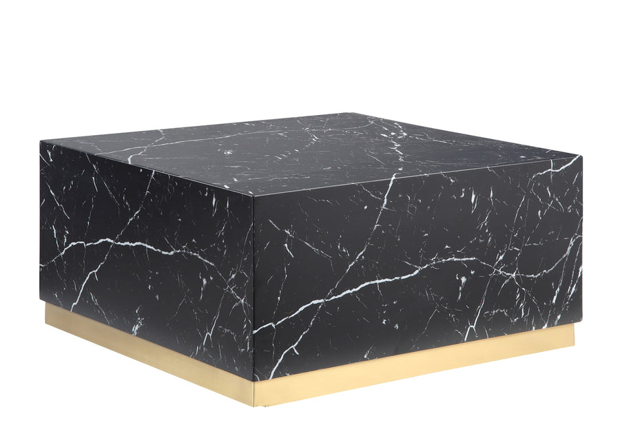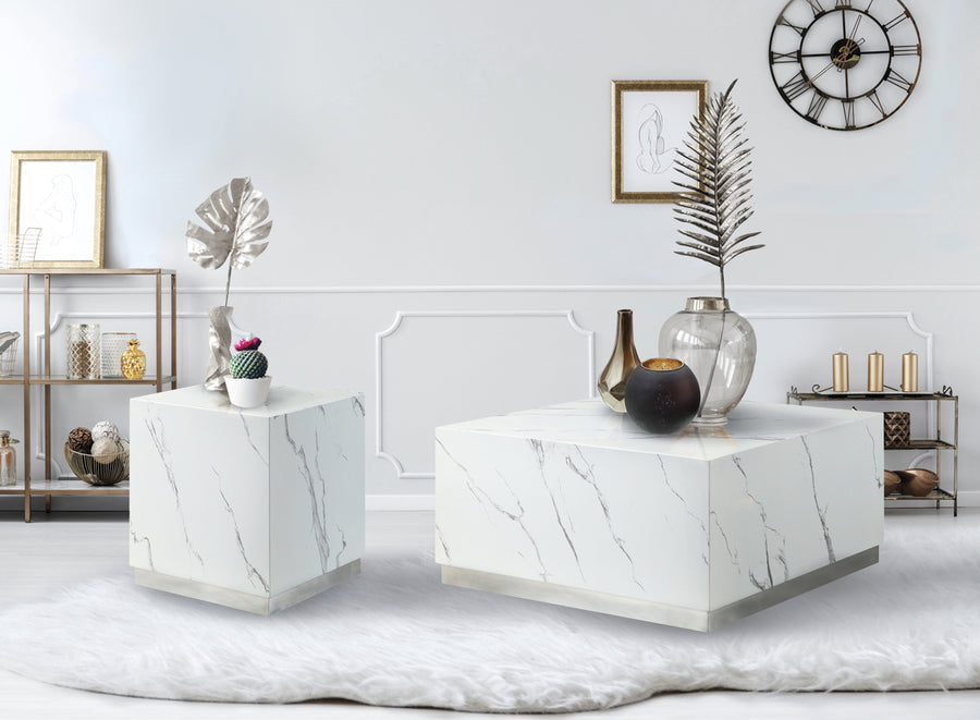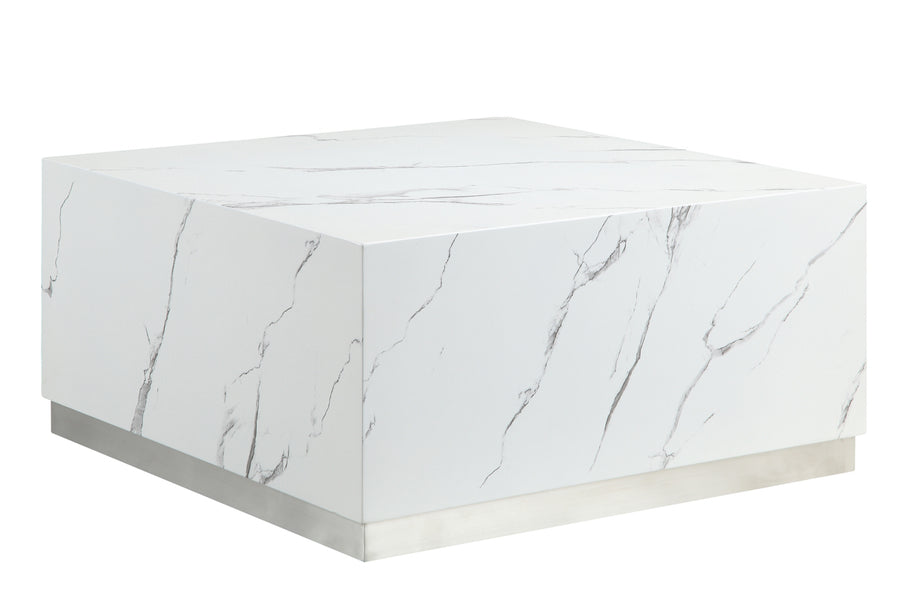Your living room is certain to stand out and delight guests with the addition of the alluring Astraia occasional collection. This eye-catching large square coffee table makes a bold statement thanks to its unique solid cube design and exquisite faux marble finish. Pristine white is shot through with grey veining, accented by the contrasting brushed nickel finish of the metal base for an extra touch of glamour. A clear matte top coat adds a subtle luster and durability, protecting your table from stains and scratches and creating a surface that is easy to clean and maintain. Luckily your Astraia table isn't as heavy as it looks - hidden casters make it a cinch to roll the table out of the way whenever needed. Coordinating small square coffee table, rectangular coffee table, and end table also available. Also available in black marble and brushed gold finish.