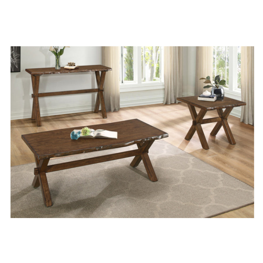 An old-world look with new-world craftsmanship, the Sansa occasional collection features a single natural cut edge, giving you the rustic appeal of the reclaimed barn wood style but modernized with smooth edges and a warm oak finish. A secure X-shaped base with an additional cross-brace ensures that the Sansa sofa table will be a sturdy cornerstone of your home for years to come. Coordinating coffee and end tables also available.